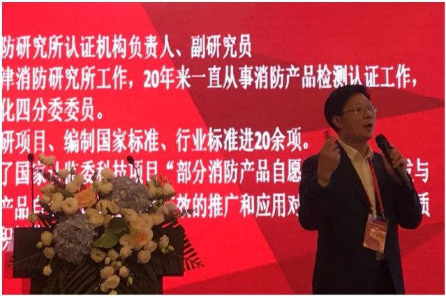 应急管理部天津消防研究所认证机构负责人、副研究员胡群明发表演讲--《防火玻璃及防火(耐火型)门窗认证》